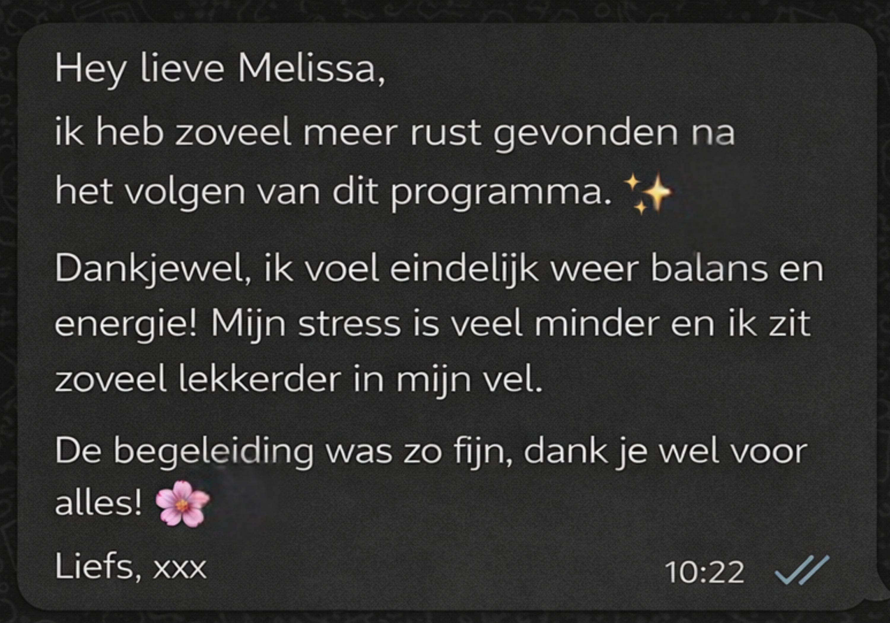 “Ik kwam binnen bij Melissa compleet uitgeput, met een hoofd vol chaos en een lijf dat alleen maar ‘stop’ riep. Stap voor stap leerde ik weer luisteren naar mezelf. Niet door harder te werken, maar door zachter te worden. Ik voel me nu gegrond, helder en vooral: krachtig op mijn eigen manier. Ik kreeg zulke goede handvaten en ben zelfs 6 kilo verloren door de tips van Melissa toe te passen!