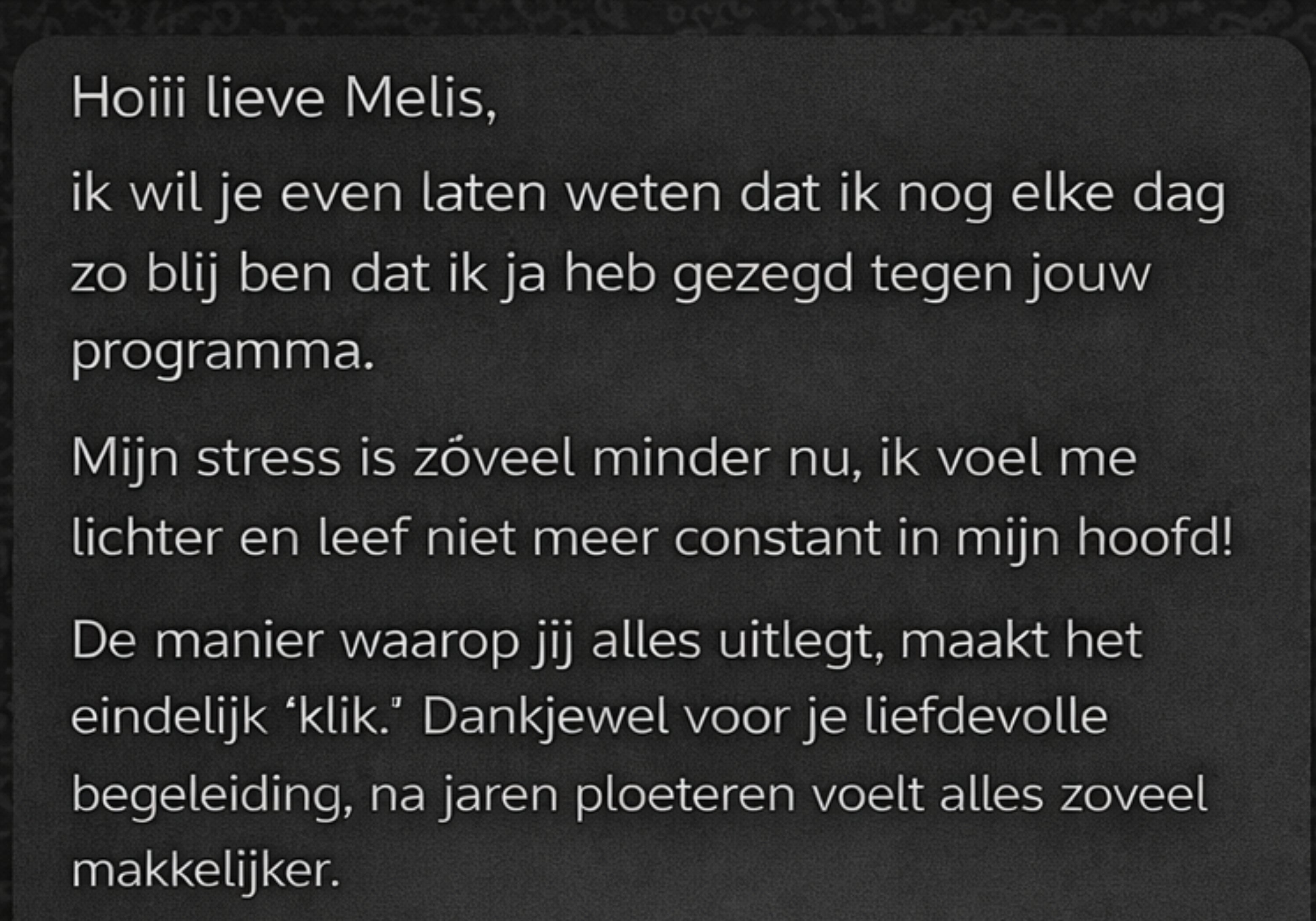 “Melissa heeft een bijzondere manier van werken: rustig, liefdevol en tegelijk ontzettend krachtig. Ze voelt feilloos aan wat er nodig is, zonder te forceren of te oordelen. Bij haar voelde ik me vanaf het eerste moment veilig om alles te delen zelfs de stukken waar ik zelf liever van wegkeek.
