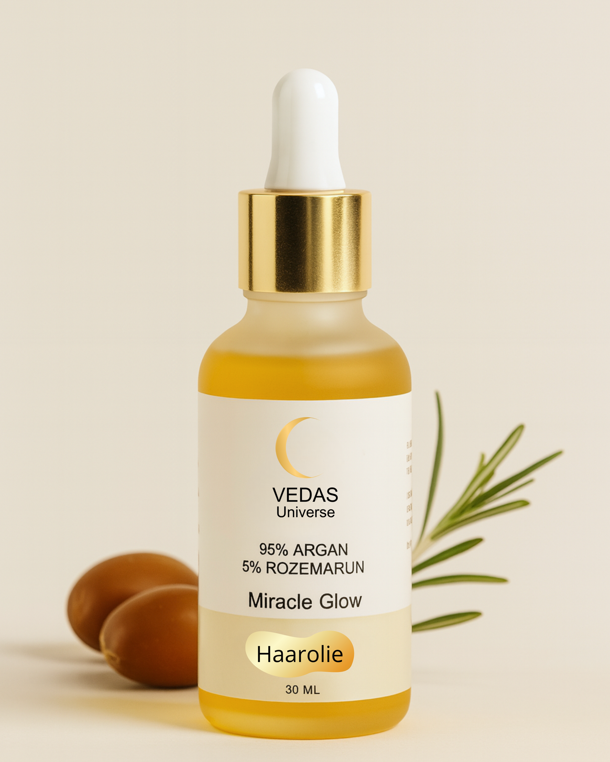 De Miracle Glow haarolie van Vedasuniverse bestaat uit 95% Biologische Arganolie en 5% pure rozemarijnolie, een uitzonderlijk hoge concentratie die je zelden vindt in haarverzorging.